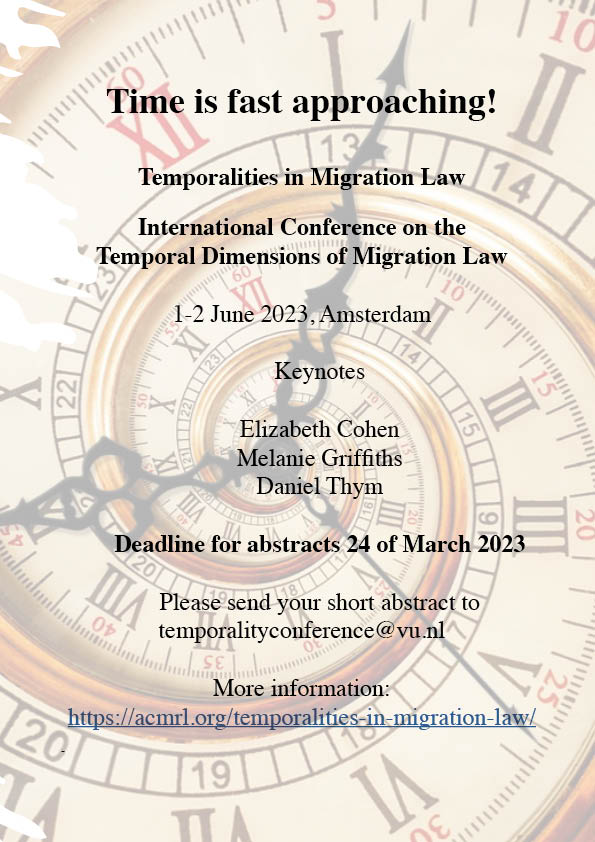 Time is fast approaching! The deadline for short abstracts for the interdisciplinary conference ‘Temporalities in Migration Law’, that I am organizing together with Patricia Mindus and Rebecca Stern is next week, the 24th of March. The conference will take place in Amsterdam, 1-2 June 2023. I would be grateful if you could further disseminate this final call for abstracts within your network and of course I very much hope that many of you will consider submitting an abstract for what promises to be an exciting event.